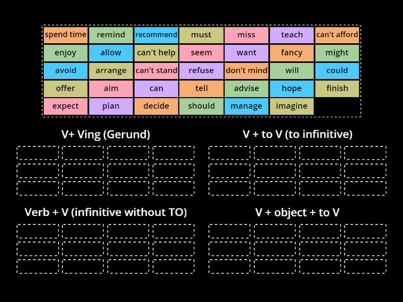 V+ Ving (Gerund): avoid, can't help, can't stand, don't mind, enjoy, fancy, finish, imagine, miss, spend time, recommend, V + to V (to infinitive): aim, arrange, can't afford, decide, expect, hope, manage, offer, plan, refuse, seem, want, Verb + V (infinitive without TO): will, can, could, must, should, might, V + object + to V: allow, advise, remind, teach, tell,