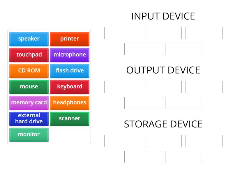 INPUT DEVICE: keyboard, mouse, scanner, microphone, touchpad, OUTPUT DEVICE: monitor, printer, speaker, headphones, STORAGE DEVICE: memory card, external hard drive, flash drive, CD ROM,