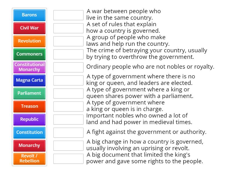 Monarchy - A type of government where a king or queen is in charge., Parliament - A group of people who make laws and help run the country., Constitution - A set of rules that explain how a country is governed., Constitutional Monarchy - A type of government where a king or queen shares power with a parliament., Civil War - A war between people who live in the same country., Treason - The crime of betraying your country, usually by trying to overthrow the government., Republic - A type of government where there is no king or queen, and leaders are elected., Magna Carta - A big document that limited the king's power and gave some rights to the people., Revolt / Rebellion - A fight against the government or authority., Revolution - A big change in how a country is governed, usually involving an uprising or revolt., Barons - Important nobles who owned a lot of land and had power in medieval times., Commoners - Ordinary people who are not nobles or royalty.,