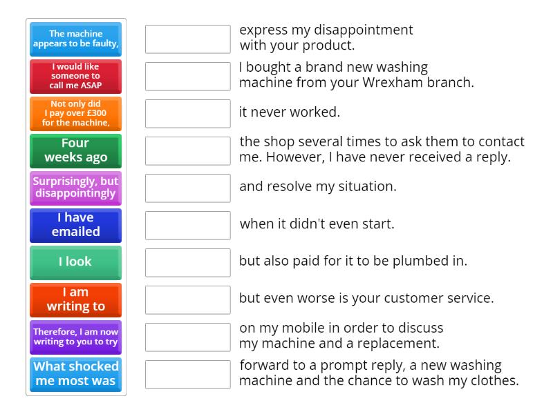 I am writing to - express my disappointment with your product. , Four weeks ago - I bought a brand new washing machine from your Wrexham branch. , Surprisingly, but disappointingly - it never worked.  , I have emailed - the shop several times to ask them to contact me. However, I have never received a reply. , Therefore, I am now writing to you to try  - and resolve my situation. , What shocked me most was - when it didn't even start., Not only did I pay over £300 for the machine,  - but also paid for it to be plumbed in. , The machine appears to be faulty, - but even worse is your customer service. , I would like someone to call me ASAP - on my mobile in order to discuss my machine and a replacement. , I look - forward to a prompt reply, a new washing machine and the chance to wash my clothes.  ,