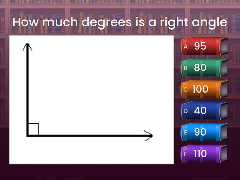 1) How much degrees is a right angle a) 80 b) 90 c) 110 d) 95 e) 100 f) 40 2) How much degrees is a acute angle a) more than 90 degrees b) more than 180 degrees c) less than 90 degrees 3) How much degrees is an obtuse a) exactly 180 degrees  b) more than 90 degrees c) less than 20 degrees 4) How much degrees is a straight angle a) 180 degrees  b) 120 degrees c) 90 degrees 5) How much degrees is a full angle a) 360 degrees b) 300 degrees c) 380 degrees 6) How much degrees is a reflex angle a) 180 degrees  b) 360 degrees c) 270 degrees