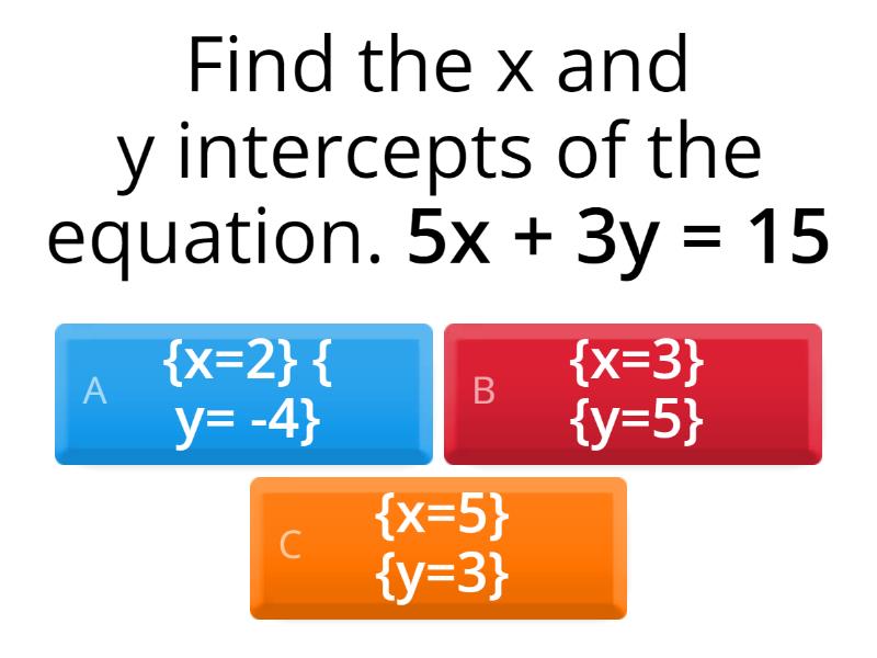 1) Find the x and y intercepts of the equation. 5x + 3y = 15  a) {x=3} {y=5} b) {x=2} { y= -4} c) {x=5} {y=3} 2) Find the x and y intercepts of the equation.  2x - y = 10 a) {x=4} {y=5} b) {x=5} {y= -10} c) {x= -5} {y= 10 } 3) Find the x and y intercepts of the equation.  -6x + 3y = 12  a) {x=2} {y=3} b) {x=4} {y=5} c) {x= -2} {y=4} 4) Write the equation in standard form using integers. y = 3x + 1   a) 2x - 1y = 2 b) 3x - y = -1 c) -3x - y = 1 5) Write the equation in standard form using integers.   y = 4x - 7  a) 4x - y = 7 b) 3x - y = 6 c) -4x - y = -7  6) Write the equation in standard form using integers.  y = 1/2 x - 10  a) x - 2y = 10 b) x - 2y = - 20 c) x - 2y = 20 7) Write the equation of the line whose graph is shown below in standard form using integers a) x + 2y = - 2 b) x + 2y = 2 c) x - 2y = 2 8) Which of the lines drawn below has x-intercept at 4 and y intercept at 5? a) b) c) 9) Find the x - and y - intercepts of the line that passes through the ordered pairs, (4,-2) and (5,-4) a) x-intercept -3 and y-intercept -6 b) x-intercept 6 and y-intecerpt 3 c) x-intercept 3 and y-intercept 6 10) lollipop question.... Find the x and y intercepts of the equation. 6x - 10y = 30   a) {x=5} {y= -3 } b) {x= 4 } {y = 3} c) {x=6} { y = 5 }