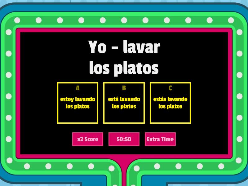 1) Yo - lavar los platos a) estoy lavando los platos b) está lavando los platos c) estás lavando los platos 2) Tú- limpiar el baño a) estoy limpiando el baño b) estamos limpiando el baño c) estás limpiando el baño 3) Tú- lavar la ropa a) estoy lavando la ropa b) estás lavando la ropa c) estamos lavando la ropa 4) Tú- lavar el coche a) estás lavando el coche b) estoy lavando el coche c) están lavando el coche 5) Tú- correr a) estoy corriendo b) estamos corriendo c) estás corriendo 6) él- beber a) estoy bebiendo b) estamos bebiendo c) está bebiendo 7) ella- escribir a) está escribiendo b) estoy escribiendo c) están escribiendo 8) Ella- cocinar a) estamos cocinando b) están cocinando c) está cocinando 9) Nosotros- poner la mesa a) estoy poniendo la mesa b) estamos poniendo la mesa c) están poniendo la mesa