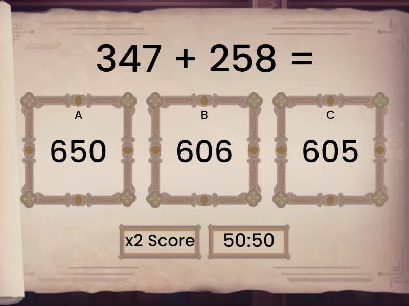 1) 347 + 258 = a) 606 b) 605 c) 650 2) 486 + 279 = a) 765 b) 766 c) 760 3) 543 + 176 = a) 791 b) 729 c) 719 4) 379 + 418 = a) 797 b) 799 c) 777 5) 596 + 384 = a) 989 b) 990 c) 980 6) 413 + 268 = a) 691 b) 688 c) 681 7) 547 + 326 = a) 873 b) 877 c) 870 8) 615 + 374 = a) 989 b) 999 c) 998 9) 682 + 347 = a) 1029 b) 9929 c) 1020 10) 759 + 428 = a) 1187 b) 1178 c) 1878