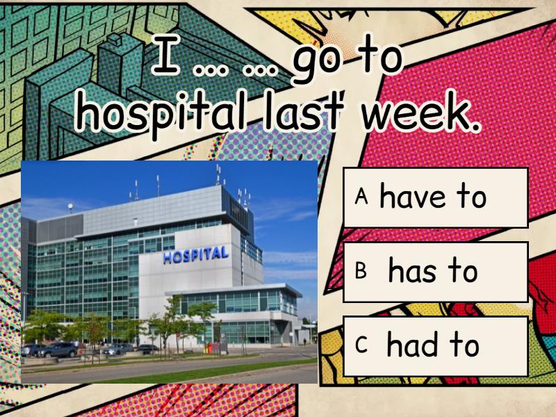 1) I ... ... go to hospital last week. a) have to b) has to c) had to 2) I ... ... get up early tomorrow. a) have to b) has to c) had to 3) My sister ... ... leave soon a) have to b) has to c) had to 4) Christian ... ... pay a parking fine yesterday. a) have to b) has to c) had to 5) My aunt ... ... go shopping now. a) have to b) has to c) had to 6) It was raining in central London I ... ... to buy an umbrella. a) have to b) has to c) had to 7) You ... ... wait in the queue. a) have to b) has to c) had to 8) She doesn't ... ... wait here. a) have to b) has to c) had to 9) I ... ... make a phone call now. a) have to b) has to c) had to 10) She ... ... clean her desk. a) have to b) has to c) had to 11) Yesterday I didn't have money I ... ... go to a bank. a) have to b) has to c) had to 12) Mary ... ... feed the hamster. a) have to b) has to c) had to 13) The boys ... ... help their mom. a) have to b) has to c) had to 14) I'm sorry, but I ... ... to go now. a) have to b) has to c) had to 15) She ... ... work yesterday. a) have to b) has to c) had to