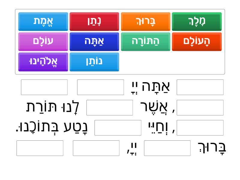 ____ אַתָּה יְיָ ____ ____ ____, אֲשֶׁר ____ לָֽנוּ תּוֹרַת ____, וְחַיֵּי ____ נָטַע בְּתוֹכֵֽנוּ. בָּרוּךְ ____ יְיָ, ____ ____