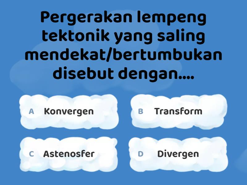 1) Pergerakan lempeng tektonik yang saling mendekat/bertumbukan disebut dengan.... a) Divergen b) Konvergen c) Transform d) Astenosfer 2) Menurut Alfred Wegener, pada mulanya hanya ada satu daratan di bumi yaitu.... a) Pangea b) Gondwana c) Laurasia d) Indo Asia 3) Berikut ini yang merupakan contoh hasil gerakan lempeng tektonik secara divergen adalah... a) b) c) d) 4) Pegunungan Himalaya terbentuk dari adanya tumbukan lempeng tektonik tipe... a) Konvergen b) Divergen c) Transform d) Eurasia 5) Bukit barisan di sumatera yang memanjang dari Sumatera bagian utara hingga Lampung terbentuk akibat adanya pergerakan lempeng tektonik tipe.... a) Transform b) Divergen c) Konvergen d) Mantel