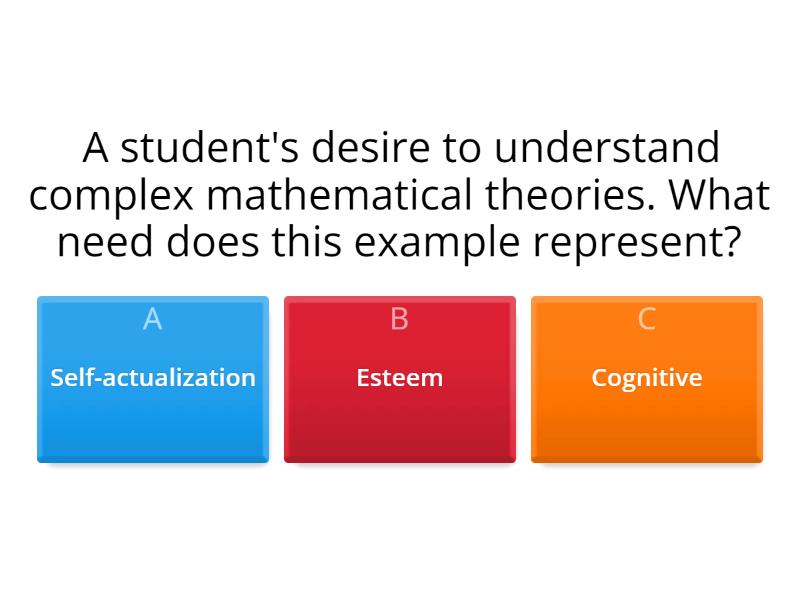 1) A student's desire to understand complex mathematical theories. What need does this example represent? a) Self-actualization b) Esteem c) Cognitive 2) Maslow's hierarchy of human needs serves as a foundation framework for understanding of... a) Behavior and ideology of individual b) Human relationships and self-esteem c) Motivation and behavior 3) Which of the following needs is at the base of Maslow's hierarchy of needs? a) Self-actualization b) Physiological c) Love and belonging d) Esteem 4) Which of the following is an example of a self-actualization need according to Maslow's hierarchy? a) Health insurance b) Respect and recognition c) Developing one's talents and potential d) Forming friendships 5) Which group of needs is concerned with basic survival and includes needs for food, sleep, security and recognition? a) Deficiency b) Growth c) Maturity