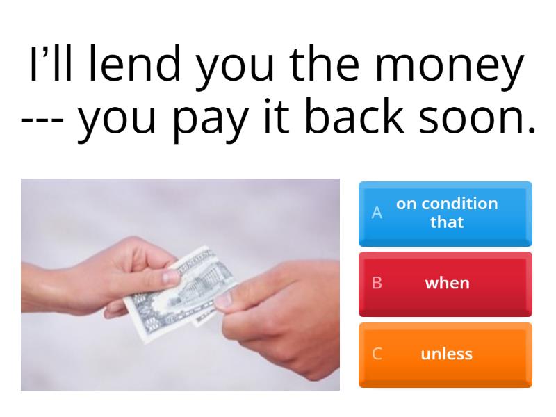 1) I’ll lend you the money --- you pay it back soon. a) on condition that b) when c) unless 2) --- it stops raining, we won’t go for a walk. a) When b) As long as c) Unless 3) I don't mind how you spend the money --- you stick to the budget. a) imagine b) as long as c) provides 4) --- we went to London, what would we do ?  a) When b) As long as c) Supposing 5) --- we get up on time, we’ll catch the train. a) Unless b) Providing c) Suposing 6) I'll talk to the press --- they don't reveal my identity. a) suppose b) on condition that c) supposing 7) --- your car broke down in the middle of nowhere, what would you do? a) Even if b) Suppose c) Unless 8) ..... the weather gets cold, you should take a jacket. a) Whether b) Unless c) In case 9) I have decided that I I won’t speak to Toby ever again --- he apologises. a) even if b) in case c) whether or not 10) There won’t be any problems --- you follow the rules exactly. a) provided that b) in case c) unless