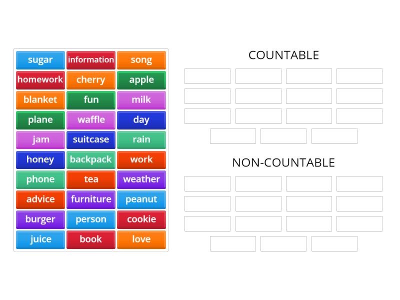 COUNTABLE: apple, cookie, waffle, peanut, burger, cherry, day, suitcase, person, blanket, plane, phone, backpack, song, book, NON-COUNTABLE: jam, sugar, juice, milk, tea, honey, love, fun, work, weather, furniture, rain, advice, information, homework,