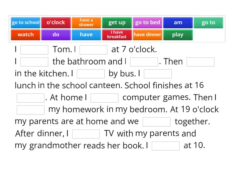 I ____ Tom. I ____ at 7 o'clock. I ____ the bathroom and I ____. Then ____ in the kitchen. I ____ by bus. I ____ lunch in the school canteen. School finishes at 16 ____. At home I ____ computer games. Then I ____ my homework in my bedroom. At 19 o'clock my parents are at home and we ____ together. After dinner, I ____ TV with my parents and my grandmother reads her book. I ____ at 10.