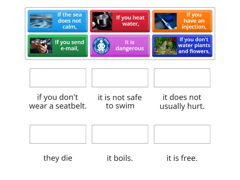If you heat water, - it boils., If you send e-mail,  - it is free., It is dangerous - if you don't wear a seatbelt., If you have an injection, - it does not usually hurt., If you don't water plants and flowers, - they die, If the sea does not calm, - it is not safe to swim,