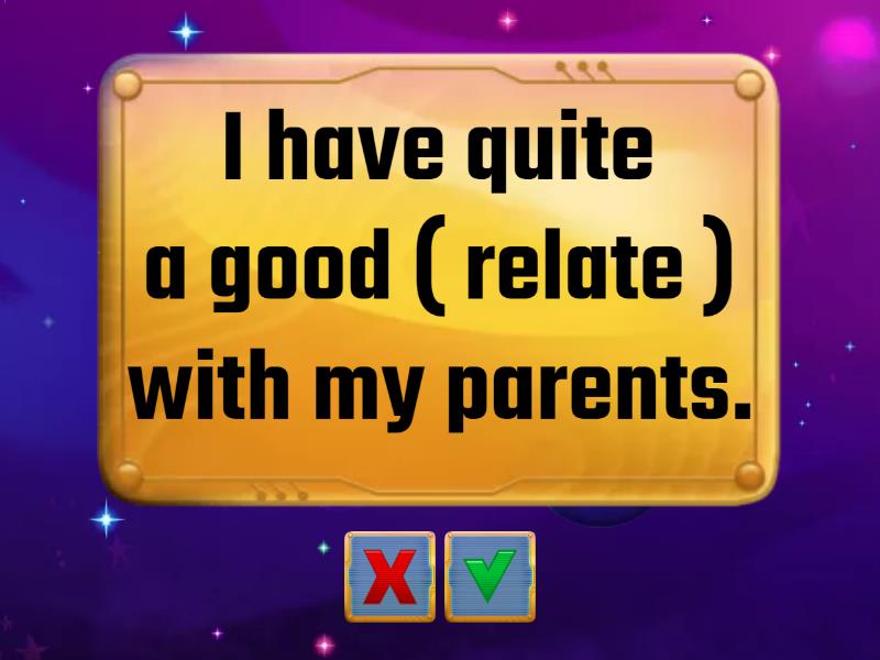 The room was in total ( dark ) - darkness , I have quite a good ( relate ) with my parents. - relationship , We asked one of the ( location ) to recommend a restaurant. - locals , ( bore ) is the enemy of learning. - boredom , Can TV violence cause aggressive ( behave ) ? - behaviour , In ( real ), violent ( crime ) are still extremely rare. - reality, crimes/ criminals , He was making his parents’ lives ( bear ). He was a complete disaster. - unbearable , Some parents have totally ( realistic ) expectations of children. - unrealistic , The army was ( capability) of defending the country by itself. - incapable , ( like ) animals, humans can think logically about the future and about hypothetical events. - unlike, They took an ( direction) route , avoiding the town centre. - indirect , These witnesses are very suspicious and ( rely ). - unreliable , He tried ( succeed ) to make them change their decision. Nothing worked out. - unsuccessfully , ( fortunately), everything turned out to be true. The news came out as a complete shock. - unfortunately , They rejected the candidate because he was totally ( suit ). - unsuitable , Plato believed that the soul is ( mortality ). - immortal , One worry is that genetic engineering could have ( predict) results - unpredictable , He is ( capability) of looking after himself. - incapable , A lot of players got ( courage ) and quit. - discouraged , Why are you being so ( attention) now? - inattentive ,
