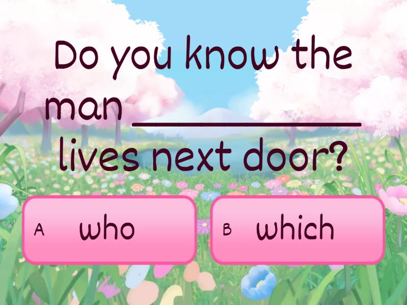 1) Do you know the man __________ lives next door? a) who b) which 2) That's the gallery __________ they had the Leonardo da Vinci exhibition. a) where b) which 3) Are your neighbours the people __________ won the lottery last year? a) that b) which 4) Do you know a good restaurant __________ is open on Sunday night? a) who b) that 5) Is that the bus __________ goes to the airport? a) who b) which 6) What was the name of the shop __________ you bought your jacket? a) where b) which 7) Maria is the woman __________ bought my old car. a) who b) which