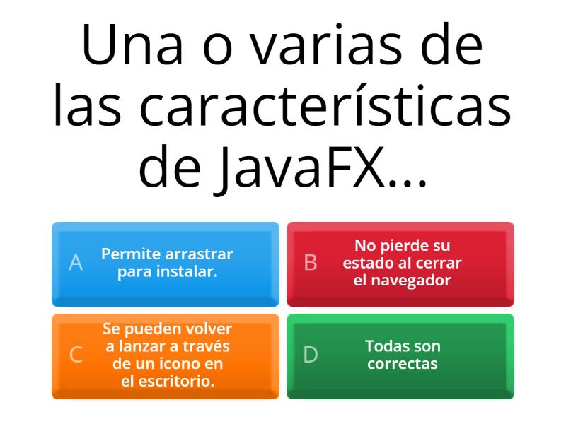 1) Una o varias de las características de JavaFX... a) Permite arrastrar para instalar. b) No pierde su estado al cerrar el navegador c) Se pueden volver a lanzar a través de un icono en el escritorio. d) Todas son correctas 2) El controlador será la clase encargada... a) De manejar los eventos de la ventana. b) De representar a las clases. c) De la vista de las ventanas que verá el usuario d) Todas son correctas 3) El fx:id sirve para... a) Sirve para definir el estilo CSS de un nodo en JavaFX. b) Sirve para especificar la ubicación de un nodo en el contenedor de diseño. c) Sirve para establecer las animaciones de un nodo en JavaFX. d) Sirve para identificar nodos en el archivo FXML y permitir la vinculación de estos nodos con el controlador en JavaFX. 4) Los tres paquetes que se recomiendan crear son: a) Controlador, modelo y vista. b) Controlador, escena y vist c) Controlador, modelo y builder d) Ninguna es correcta. 5) Marca la INCORRECTA: a) JavaFX soporta propiedades. b) JavaFX puede ser personalizado con CSS c) JavaFX tiene efectos especiales. d) JavaFX utiliza JOptionpane. 6) Scene Builder... a) Nos ayuda a construir una interfaz de usuario. b) Se ocupará de realizar nuestras vistas. c) Es necesario instalarla en nuestro netbeans. d) Todas son correctas. 7) El SDK es... a) El SDK es un sistema operativo específico para el desarrollo de aplicaciones. b) El SDK es un conjunto de herramientas de desarrollo de software que incluye bibliotecas, documentación y ejemplos para ayudar a los desarrolladores a crear aplicaciones. c) El SDK es una herramienta exclusiva para la edición de imágenes y gráficos. d) El SDK es un paquete de software que contiene aplicaciones de oficina, como procesadores de texto y hojas de cálculo, diseñado para facilitar tareas administrativas sin requerir conocimientos de programación. 8) Una de las diferencias de JavaFX y Swing... a) JavaFX ha mejorado el manejo de eventos. b) JavaFX utiliza JOptionPane. c) En Swing todo es escenario. d) Todas son correctas. 9) Por JavaFX entendemos... a) Plataforma de software pensada para crear y desplegar aplicaciones ricas de internet (RIA), que funciona soportados en dispositivos móbiles b) Plataforma de software pensada para crear y desplegar aplicaciones ricas de internet (RIA), que funcionan en Java Runtime Exception JRE. c) Plataforma de software pensada para crear y desplegar aplicaciones ricas de internet (RIA), que funciona en una gran variedad de dispositivos. d) Todas son correctas. 10) Production Suite es... a) Production Suite es un conjunto de herramientas y aplicaciones utilizadas en la postproducción audiovisual para la edición de vídeo, audio y efectos especiales. b) Production Suite es un sistema operativo especializado en la gestión de redes empresariales. c) Production Suite es un paquete de aplicaciones diseñado para la contabilidad y la gestión financiera de empresas, incluyendo herramientas para la creación de informes financieros, la gestión de nóminas y el análisis de gastos. d) Production Suite es una aplicación para la edición de documentos y hojas de cálculo en oficinas.