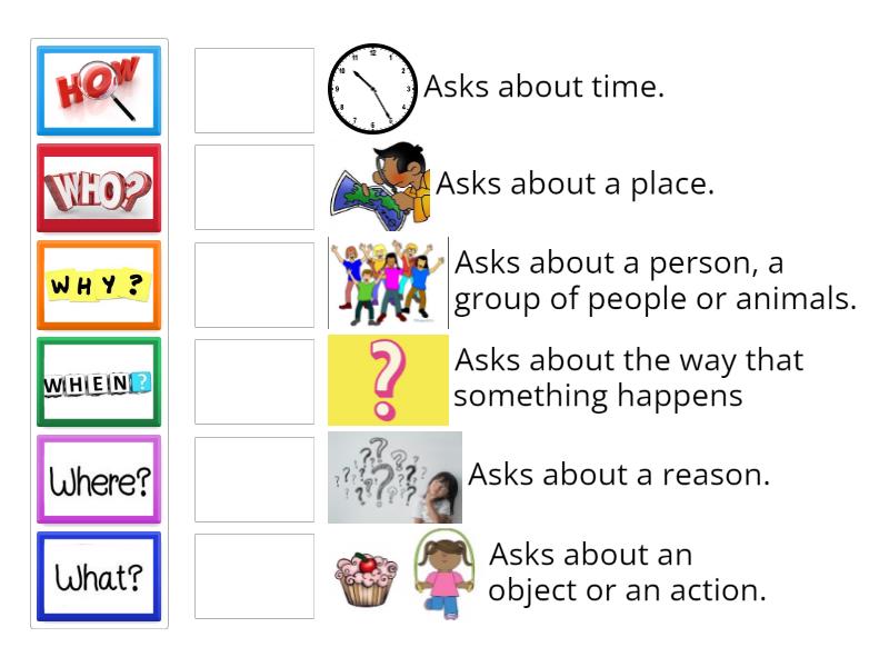 Asks about a reason. , Asks about time., Asks about a place., Asks about an object or an action., Asks about a person, a group of people or animals., Asks about the way that something happens,
