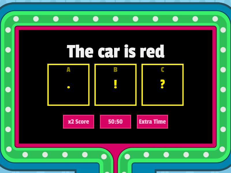 1) The car is red a) . b) ! c) ? 2) Where is the dog a) . b) ! c) ? 3) I love ice cream a) . b) ! c) ? 4) What time is it a) . b) ! c) ? 5) Ben ate the apple a) . b) ! c) ? 6) You are great a) . b) ! c) ? 7) Are you going to school today a) . b) ! c) ? 8) Wow, it is hot today a) . b) ! c) ? 9) Put the books back on the shelf a) . b) ! c) ? 10) Did you see that a) . b) ! c) ? 11) Brush your teeth and go to bed a) . b) ! c) ? 12) Ouch a) . b) ! c) ?