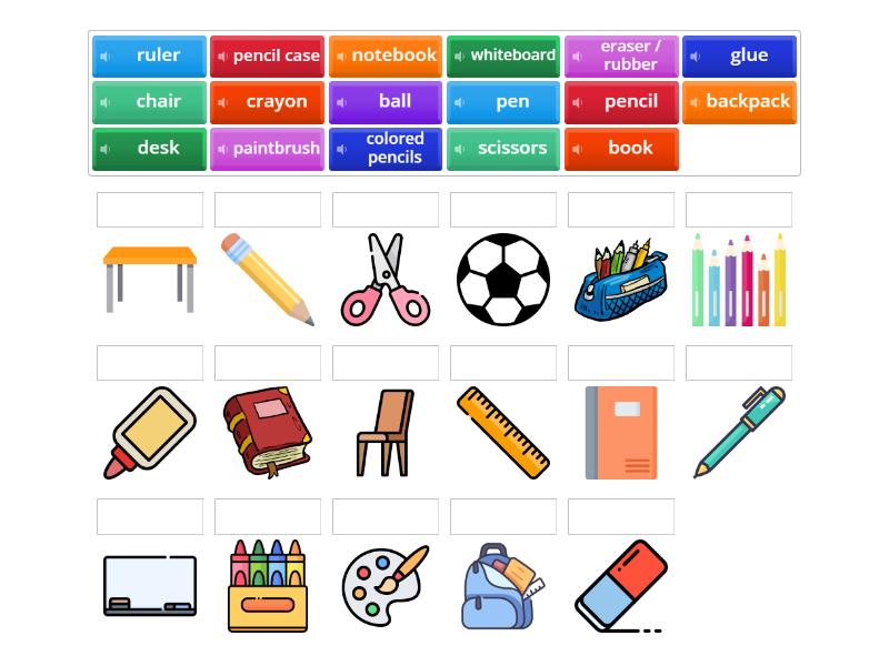 notebook, ball, paintbrush, glue, scissors, desk, whiteboard, eraser / rubber, ruler, book, pen, pencil, pencil case, backpack, chair, colored pencils, crayon,