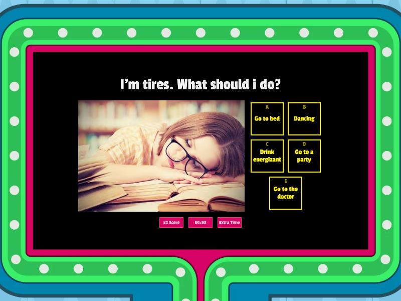 1) I'm tires. What should i do? a) Go to bed b) Dancing c) Drink energizant d) Go to a party e) Go to the doctor 2) María is hungry. She should a) Drink water b) She shouldn't eat c) Eat a small chocolate d) Eat a sándwich 3) My brother is sick. He shouldn't a) Go to the doctor b) Play football c) Stay in Home d) Take a remadies e) Eat fast food