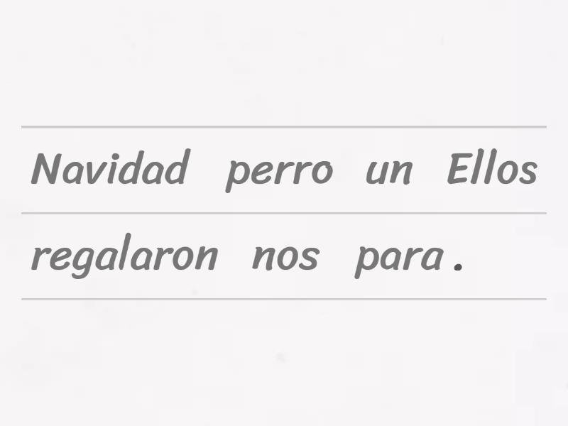Ellos nos regalaron un perro para Navidad. , Lo vamos a llamar Spike. , Roberto le escribió una carta a su abuela. , Se la va a mandar mañana. , Nosotros te mandamos dinero por Venmo., Yo siempre les digo la verdad a mis hijos. , Se la digo siempre. , El camarero nos sirvió una pizza deliciosa. , Nos la sirvió con queso. , Ustedes les compran helado a los niños. , Se lo comen muy rápido. , Susana les muesta las fotos de su viaje a sus padres., Sus padres las miran con interés. , Ellos nos traen café y postre., Nos los traen rápido. , Tú le pides su tarea a Elizabeth pero no la tiene. , Yo le compré una tarjeta de Amazon a Alma. , Se la di para su cumpleaños. , ¿Le mandaste un texto a Felipe hoy? , Sí, se lo mandé. ,