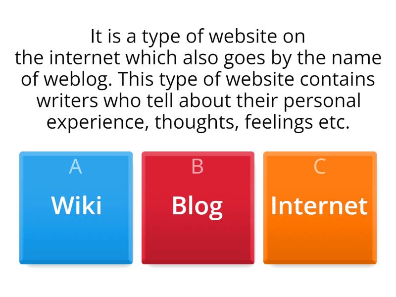 1) It is a type of website on the internet which also goes by the name of weblog. This type of website contains writers who tell about their personal experience, thoughts, feelings etc. a) Wiki b) Blog c) Internet 2) It contains trends in fashion, seasonal clothing, new fashion styles/ designs from well-known brands, prices, and the likes a) Food Blog b) Beauty Blog c) Fashion Blog 3) It contains traveling experiences to both local and international places, accompanied with pictures including beautiful sceneries, hotel and lodging etc. a) Travel Blog b) Fashion Blog c) Music Blog 4) It contains updates in album releases of popular singers or bands. It features music from Indie, pop and a) Fashion Blog b) Music Blog c) Travel Blog 5) It contains beauty products, how they are used and what they do to the skin, face and body. a) Beauty Blog b) Food Blog c) Fashion