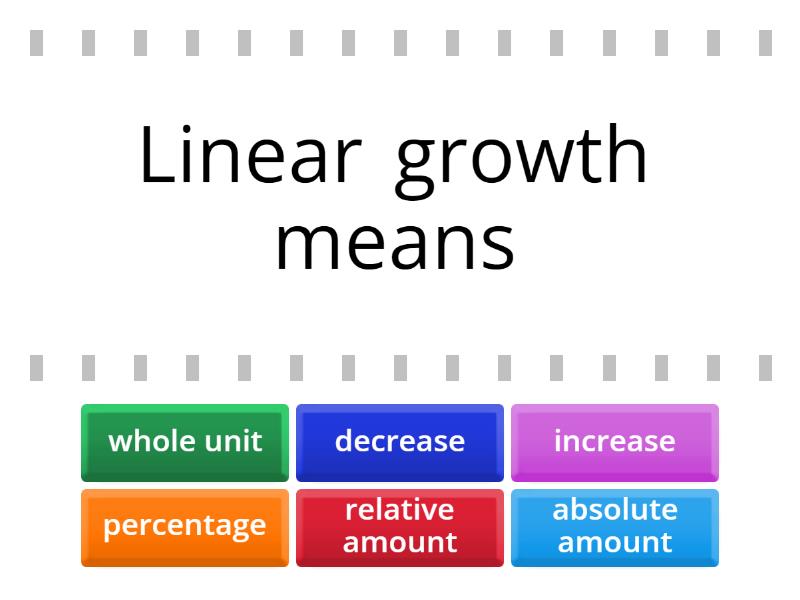 absolute amount - Linear growth means, relative amount - Exponential growth means , percentage - Relative implies, whole unit - Absolute implies, increase - Exponential growth is , decrease - Exponential decay is ,