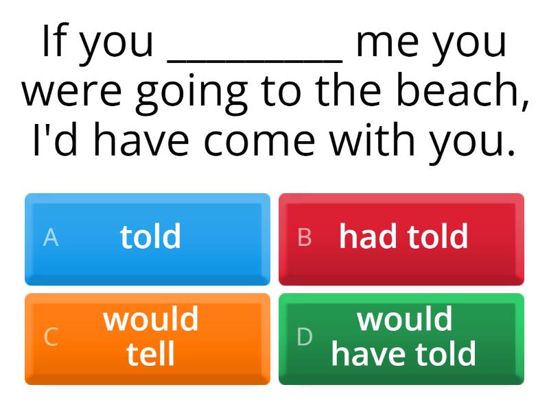 1) If you _________ me you were going to the beach, I'd have come with you. a) told b) had told c) would tell d) would have told 2) If I had won the lottery _________ a) I would have bought a car. b) I will buy a car c) I am going to buy a car. 3) If they had not passed their exam _________ a) their teacher will be sad. b) their teacher would have been sad. c) their teacher is going to be sad. 4) If it had rained_________ a) I would catch the bus to college. b) I would have caught the bus to college. c) I will catch the bus to college 5) Would you have stayed at home _________ a) if it had rained yesterday? b) if it was raining yesterday? c) if it rained yesterday? 6) If Dan had missed the plane, he _________ very annoyed. a) had been b) was c) would be d) would have been 7) I'd have got you a present if I _________ it was your birthday. a) knew b) had known c) would have known d) would know 8) I would have believed you _________ a) if you hadn't lied to me before. b) if you lied to me before. c) if you were lying to me before. 9) You could have been on time _________ a) if you caught the bus on time. b) if you had caught the bus on time. c) if you didn't catch the bus on time. 10) If the car _________, I wouldn't have been late. a) didn't break down b) hadn't broken down c) wouldn't break down d) wouldn't have broken down 11) If I had worked harder and started revising earlier _________ a) I should pass the exam. b) I will pass the exam. c) I might have passed the exam. 12) If you _________ me, I wouldn't have finished in time. a) didn't help b) hadn't helped c) wouldn't help d) wouldn't have helped 13) We _________ lost if we'd taken a map with us. a) Didn't get b) hadn't got c) wouldn't have got d) wouldn't get