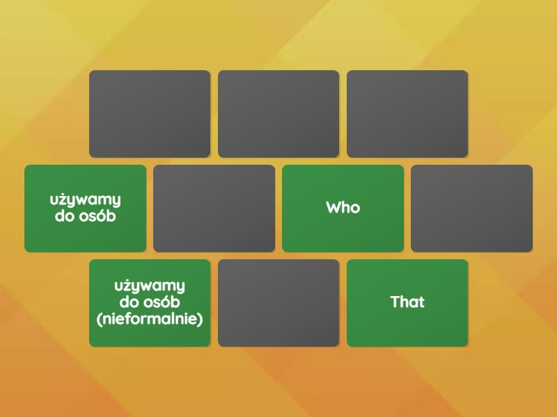Who - używamy do osób, That - używamy do osób (nieformalnie), that - używamy do rzeczy (nieformalnie, whose - używamy żeby wyrazić przynależność, which - używamy do rzeczy,