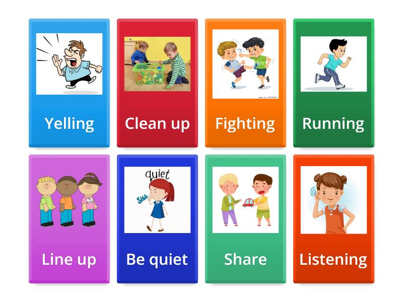 Clean up, Be quiet, Yelling, Fighting, Share, Line up, Listening, Running,