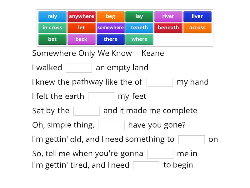 Somewhere Only We Know – Keane I walked ____ an empty land I knew the pathway like the of ____ my hand I felt the earth ____ my feet Sat by the ____ and it made me complete Oh, simple thing, ____ have you gone? I'm gettin' old, and I need something to ____ on So, tell me when you're gonna ____ me in I'm gettin' tired, and I need ____ to begin I came across a ____ tree I felt the ____ of it looking at me Is this the place we used to ____ Is this the place that I've been ____ of? Oh, simple ____, where have you gone? I'm gettin' old, and I ____ something to rely on So, tell me when you're gonna let me in I'm gettin' tired, and I need somewhere to begin And if you have a ____, why don't we go? Talk about it somewhere only we know? This could be the end of everything So, why don't we go Somewhere only we know Somewhere only we know Oh, simple thing, where have you gone? I'm getting old, and I need something to rely on So, tell me ____ you're gonna let me in I'm getting tired, and I need somewhere to begin And if you have a minute, why don't we go Talk about it somewhere only we know? This could be the end of ____ So, why don't we go somewhere only we know? Somewhere only we know Somewhere only we know