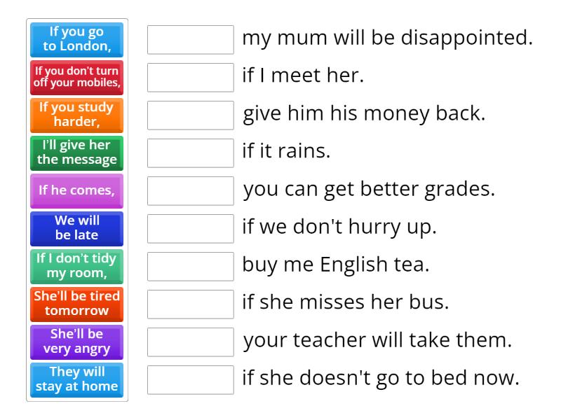 We will be late - if we don't hurry up., If I don’t tidy my room, - my mum will be disappointed., They will stay at home - if it rains., If he comes, - give him his money back., I’ll give her the message - if I meet her., If you study harder, - you can get better grades., She’ll be tired tomorrow - if she doesn't go to bed now., If you don’t turn off your mobiles, - your teacher will take them., If you go to London, - buy me English tea., She’ll be very angry - if she misses her bus.,