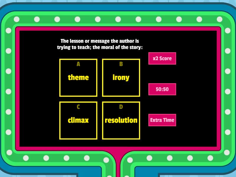 1) The lesson or message the author is trying to teach; the moral of the story: a) theme b) irony c) climax d) resolution 2) Settles what has changed in the story; the tension decreases: a) internal conflict b) resolution c) falling action d) antagonist 3) Anything that represents (stands for) something else, either directly or indirectly: a) plot b) climax c) symbolism (symbol) d) theme 4) The struggle between characters and the outside forces that are preventing them from getting what they want: a) internal conflict b) foreshadowing c) setting d) external conflict 5) A series (order) of events in a story: a) protagonist b) plot c) resolution d) setting 6) The problem in the story: a) rising action b) exposition c) irony d) conflict 7) A hint or clue at something to come later in the story: a) foreshadowing b) flashback c) falling action d) rising action 8) The conflict increases; suspense rises: a) plot b) rising action c) falling action d) antagonist 9) The individual, group, institution, force of nature, or personal conflict standing in the way of the story's goal: a) symbolism (symbol) b) climax c) antagonist d) protagonist 10) The main character in the selection; a central figure whom the story centers around: a) internal conflict b) irony c) antagonist d) protagonist 11) Loose ends are tied up; the story ends: a) resolution b) exposition c) foreshadowing d) conflict 12) The struggle between emotions, values, or desires within a character that are preventing them from achieving their desired goals: a) climax b) internal conflict c) external conflict d) flashback 13) A character remembers an earlier event that happened before the current point of the story: a) foreshadowing b) irony c) flashback d) setting 14) Introduces the characters, setting, basic situation, and conflict: a) protagonist b) plot c) resolution d) exposition 15) The time and place of the story: a) irony b) flashback c) plot d) setting 16) Highest point of tension or drama in a story, when the main problem of the story is faced and solved, a change in the character or situation happens: a) internal conflict b) climax c) antagonist d) rising action 17) The opposite of what is expected happens: a) irony b) theme c) setting d) symbolism (symbol)