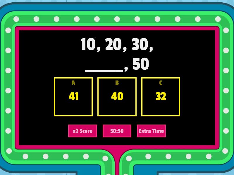 1) 10, 20, 30, _____, 50 a) 41 b) 40 c) 32 2) 60, ____, 80. 90 a) 70 b) 75 c) 120 3) 55,____,75,85 a) 56 b) 45 c) 65 4) 2,12,_____,32 a) 22 b) 13 c) 52 5) 50,___,70,80 a) 51 b) 55 c) 60 6) 90,_____,110 a) 101 b) 100 c) 91 7) 70,______,90,100 a) 75 b) 80 c) 84 8) ______,56,66,76 a) 46 b) 55 c) 50 9) 0,10,______ a) 11 b) 20 c) 12 10) 37,47,_____,67 a) 55 b) 48 c) 57 11) 45, 55, 65, 75, _____ a) 80 b) 85 c) 90 12) 20, 30, ____ a) 40 b) 45 c) 50 13) 31, 41, 51, 61, 71, ______ a) 72 b) 80 c) 81 14) 30, 40, _____ a) 50 b) 60 c) 70