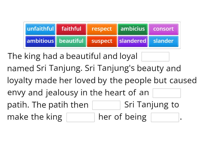 The king had a beautiful and loyal ____ named Sri Tanjung. Sri Tanjung's beauty and loyalty made her loved by the people but caused envy and jealousy in the heart of an ____ patih. The patih then ____ Sri Tanjung to make the king ____ her of being ____. However, her plans did not go as ____ and the short ____ of time made it difficult for Ariel to approach the prince in a way that truly ____ her feelings. Despite managing to meet the prince, Ariel felt ____ in an unbearable silence and an inability to ____ her love in words.