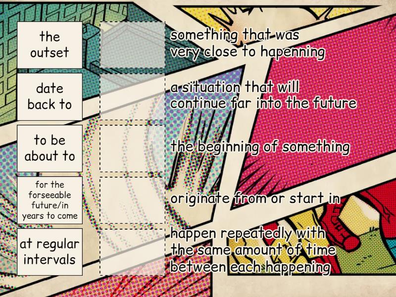 date back to - originate from or start in, to be about to - something that was very close to hapenning, for the forseeable future/in years to come - a situation that will continue far into the future, at regular intervals - happen repeatedly with the same amount of time between each happening, the outset - the beginning of something,