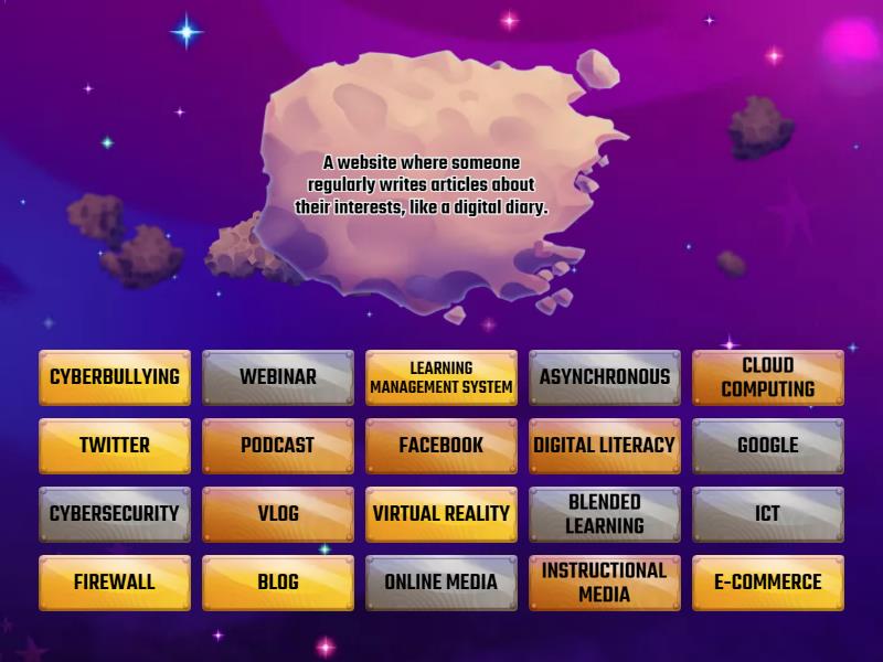 BLOG - A website where someone regularly writes articles about their interests, like a digital diary., BLENDED LEARNING - Mixing in-person classes with online learning activities. Like having a cooking class where you learn the basics in person, then practice recipes online., CLOUD COMPUTING - Renting storage space and computer power from the internet, instead of having it on your own device. Think of it like renting a toolbox instead of buying all the tools yourself., CYBERBULLYING - Using technology to be mean to someone online, like sending nasty messages or spreading rumors., CYBERSECURITY - Protecting your devices and information from online threats, like keeping your house safe with an alarm system., DIGITAL LITERACY - Knowing how to use technology effectively and safely. It's like learning to read and write, but for the digital world!, E-COMMERCE - Buying and selling things online, like shopping at a virtual store., ASYNCHRONOUS - Communication that doesn't happen at the same time. Imagine two people sending emails back and forth, FACEBOOK - A social media platform where you connect with friends and family, share posts, and see what others are up to., FIREWALL - A security system that checks what comes in and out of your computer, like a guard at a castle gate., ICT - All the technology we use to communicate and share information, like computers, phones, and the internet., INSTRUCTIONAL MEDIA - Tools used for teaching and learning, like videos, pictures, or interactive games. Imagine educational flashcards, but on a computer!, LEARNING MANAGEMENT SYSTEM - A special website that teachers can use to organize online classes, assignments, and grades. Like a digital classroom planner., ONLINE MEDIA - Any content you can access on the internet, like websites, videos, or games., PODCAST - An audio series with episodes you can listen to on your phone or computer, like a portable radio show., VIRTUAL REALITY - A technology that creates a simulated world you can explore using a special headset. Imagine stepping into a video game!, WEBINAR - A live online presentation or lecture that people can attend from their devices. Like a class happening over video call., VLOG - A blog where the posts are videos instead of written text. Like a video diary you share online., TWITTER - A social media platform where you can share short messages and updates with followers, like mini-text messages to the world., GOOGLE - A search engine that helps you find information online. It's like a giant library card catalog for the internet.,