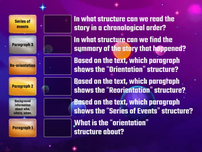 Paragraph 1 - Based on the text, which paragraph shows the “Orientation” structure?, Paragraph 2 - Based on the text, which paragraph shows the “Series of Events” structure?, Paragraph 3 - Based on the text, which paragraph shows the “Reorientation” structure?, Background information about who, where, when. - What is the “orientation” structure about?, Re-orientation - In what structure can we find the summary of the story that happened?, Series of events - In what structure can we read the story in a chronological order? ,