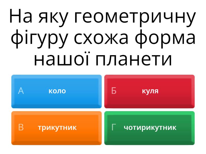 1) На яку геометричну фігуру схожа форма нашої планети a) коло b) куля c) трикутник d) чотирикутник 2) За сучасними уявленнями наша планета сплюснута біля a) екватора b) нульового меридіану c) полюсів d) вісі Землі 3) Точки в яких зєднуються всі меридіани a) полюси b) вісь Землі c) екватор d) Грінвіцький меридіан 4) Скільки полюсів виділяють на нашій планеті a) 1 b) 2 c) 3 d) 4 5) На скільки півкуль поділена наша планета a) 1 b) 2 c) 3 d) 4 6) Уявна лінія, навколо якої обертається наша планета a) вісь Землі b) меридіани c) паралель d) екватор 7) Уявна лінія що зєднує Північний і Південний полюси a) вісь Землі b) меридіани c) паралель d) екватор 8) Найдовша паралель a) вісь Землі b) меридіани c) паралель d) екватор 9) Який напрямок вказують паралелі a) північ - південь b) захід - схід c) північ - захід d) південь - схід 10) На які півкулі екватор ділить нашу планету a) Північну та Південну b) Західну та Східну c) Східну та Північну d) Західну та Південну