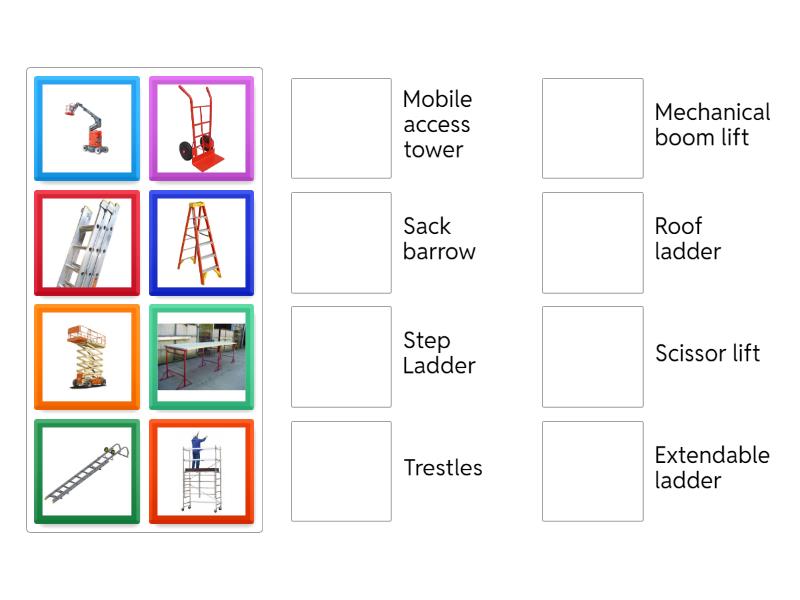 Step Ladder , Extendable ladder, Trestles, Mobile access tower, Scissor lift, Mechanical boom lift, Sack barrow, Roof ladder,