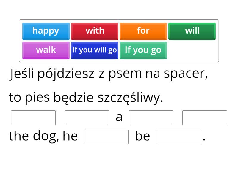 Jeśli pójdziesz z psem na spacer, to pies będzie szczęśliwy. ____ ____ a ____ ____ the dog, he ____ be ____. Jeśli pójdziesz z psem na spacer, to pies będzie szczęśliwy. If you ____ the ____, it ____ be ____. Jeśli będziesz się dobrze uczyć, to kupię ci barbie. If you ____ ____, I ____ ____ ____ a barbie. Jeśli nie przestaniesz, to nie dostaniesz pączka. If you ____ stop, you ____ ____ ____ the donut. Nie pójdziesz do szkoły, jeśli nie zjesz śniadania. You ____ ____ go to school if you ____ ____ the breakfast.