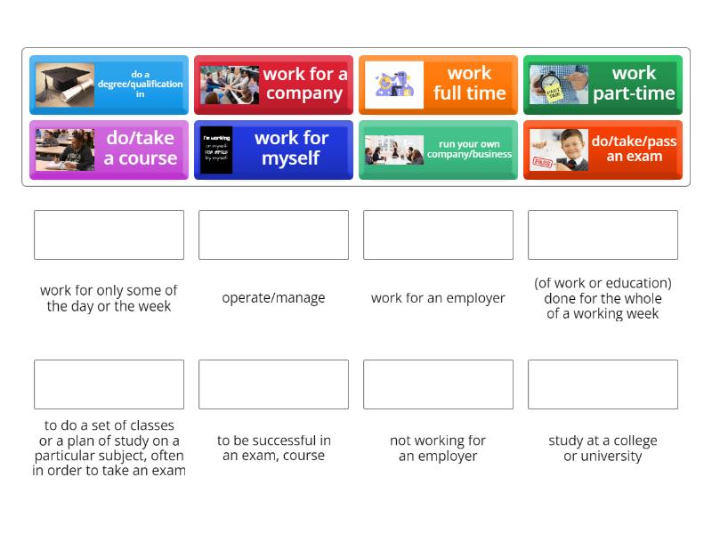 do/take a course - to do a set of classes or a plan of study on a particular subject, often in order to take an exam, do a degree/qualification in - study at a college or university, do/take/pass an exam - to be successful in an exam, course, run your own company/business - operate/manage , work for myself - not working for an employer, work for a company - work for an employer, work part-time - work for only some of the day or the week, work full time - (of work or education) done for the whole of a working week,
