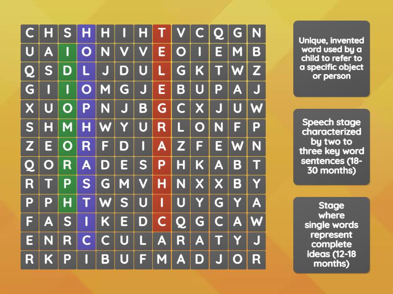 Idiomorph - Unique, invented word used by a child to refer to a specific object or person, Holophrastic - Stage where single words represent complete ideas (12-18 months), Telegraphic - Speech stage characterized by two to three key word sentences (18- 30 months),