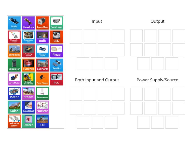 Input: Ultrasonic Sensor, Touchpad, Switch, InfraRed Sensor, Ultraviolet sensor, Capacitive sensor, Inductive sensor, Proximity sensor, Contact sensor, Microphone, Output: Motor, Bulb, LED, Stepper Motor, Servo Motor, Both Input and Output: Piezo, Calculator, PLC, Power Supply/Source: Power Supply, Power Adaptor, Solar, Steam, Pneumatics (Air), Hydraulics (FLuids/Oil), Nuclear, Oil, Gas Plants, Windmills, Turbines,