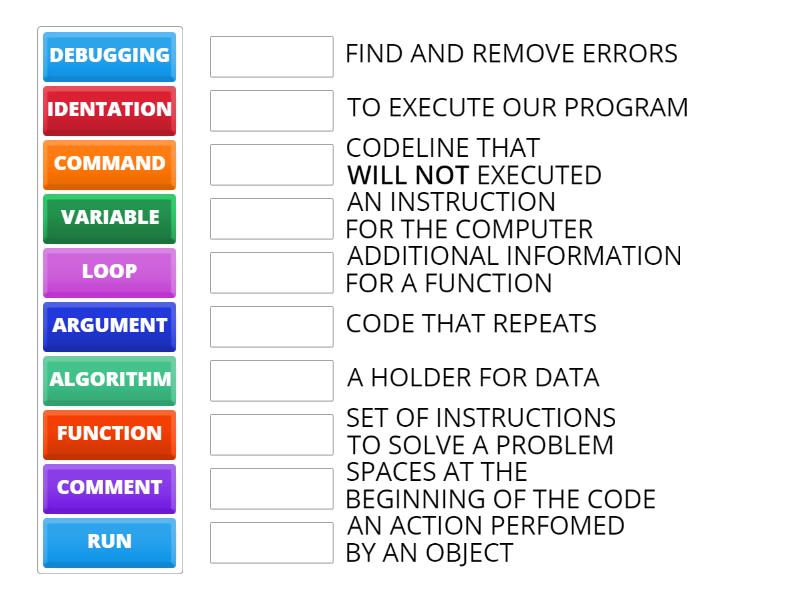 ALGORITHM - SET OF INSTRUCTIONS TO SOLVE A PROBLEM, ARGUMENT - ADDITIONAL INFORMATION FOR A FUNCTION, IDENTATION - SPACES AT THE BEGINNING OF THE CODE, COMMENT - CODELINE THAT WILL NOT EXECUTED, COMMAND - AN INSTRUCTION FOR THE COMPUTER, DEBUGGING - FIND AND REMOVE ERRORS, RUN - TO EXECUTE OUR PROGRAM, LOOP - CODE THAT REPEATS, FUNCTION - AN ACTION PERFOMED BY AN OBJECT, VARIABLE - A HOLDER FOR DATA,