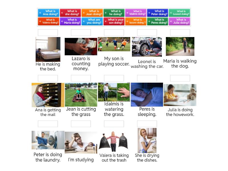 What are you doing? - I'm studying, What is Valera doing? - Valera is taking out the trash, What is Maria doing? - Maria is walking the dog., What is your son doing? - My son is playing soccer., What is Idalmis doing? - Idalmis is watering the grass., What is Leonel doing? - Leonel is washing the car., What is Peres doing? - Peres is sleeping., What is lazaro doing ? - Lazaro is counting money., What is she doing?  - She is drying the dishes., What is he doing? - He is making the bed., What is Jean doing? - Jean is cutting the grass, What is Ana doing? - Ana is getting the mail, What is Julia doing?  - Julia is doing the howework., What is Peter doing? - Peter is doing the laundry.,