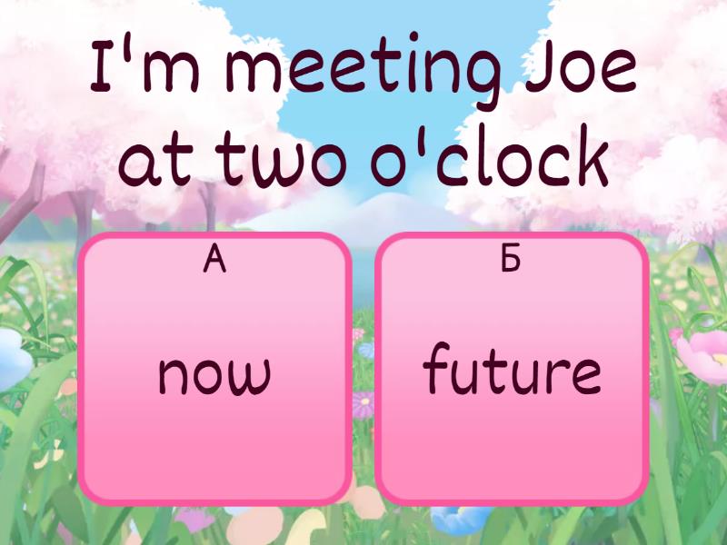 1) I'm meeting Joe at two o'clock a) now b) future 2) I'm living in a flat with two Swedish boys a) now b) future 3) We're coming back on Monday a) now b) future 4) She's moving to Canada soon a) now b) future 5) I'm waiting for the postman a) now b) future 6) I'm reading a really good book about science a) now b) future 7) We're meeting Sally and James for lunch on Sunday a) now b) future 8) Karl is arriving at 6 o'clock a) now b) future 9) I'm studying for my math exam a) now b) future 10) Pam is going shopping after lunch a) now b) future