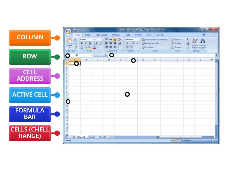 ACTIVE CELL, CELLS (CHELL RANGE), COLUMN, ROW, CELL ADDRESS, FORMULA BAR.