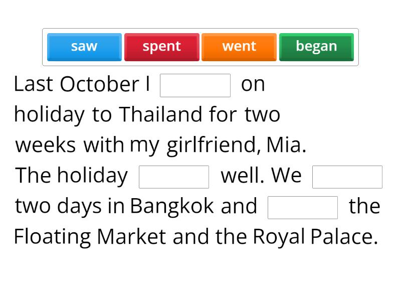 Last October I ____ on holiday to Thailand for two weeks with my girlfriend, Mia. The holiday ____ well. We ____ two days in Bangkok and ____ the Floating Market and the Royal Palace. But things ____ wrong when we ____ Bangkok. I I ____ to stay in hostels, which ____ basic but clean, but Mia ____ they were too uncomfortable and so we ____ in quite expensive hotels. I ____ to experience the local atmosphere but Mia just wanted to go shopping. I ____ I ____ Mia very well, but you don't know a person until you travel with them. It ____ awful! We ____ about everything. For our last four days we ____ to a beautiful island. It was like being in paradise. The weather ____ lovely and the beaches ____ wonderful, but we just ____ without speaking. We ____ our last night back in Bangkok and we went for a drink. That was the end.