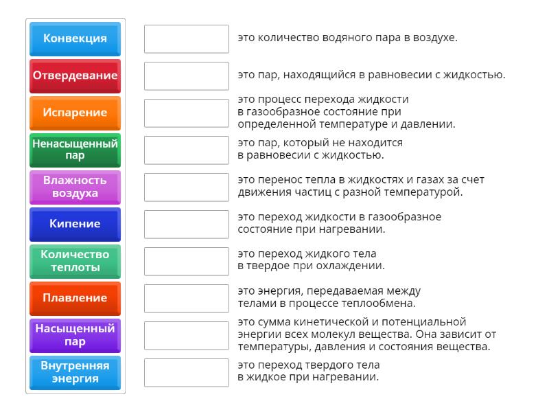 Внутренняя энергия - это сумма кинетической и потенциальной энергии всех молекул вещества. Она зависит от температуры, давления и состояния вещества., Конвекция - это перенос тепла в жидкостях и газах за счет движения частиц с разной температурой., Количество теплоты - это энергия, передаваемая между телами в процессе теплообмена., Плавление - это переход твердого тела в жидкое при нагревании., Отвердевание - это переход жидкого тела в твердое при охлаждении., Насыщенный пар - это пар, находящийся в равновесии с жидкостью., Ненасыщенный пар - это пар, который не находится в равновесии с жидкостью., Испарение - это переход жидкости в газообразное состояние при нагревании., Кипение - это процесс перехода жидкости в газообразное состояние при определенной температуре и давлении., Влажность воздуха - это количество водяного пара в воздухе.,