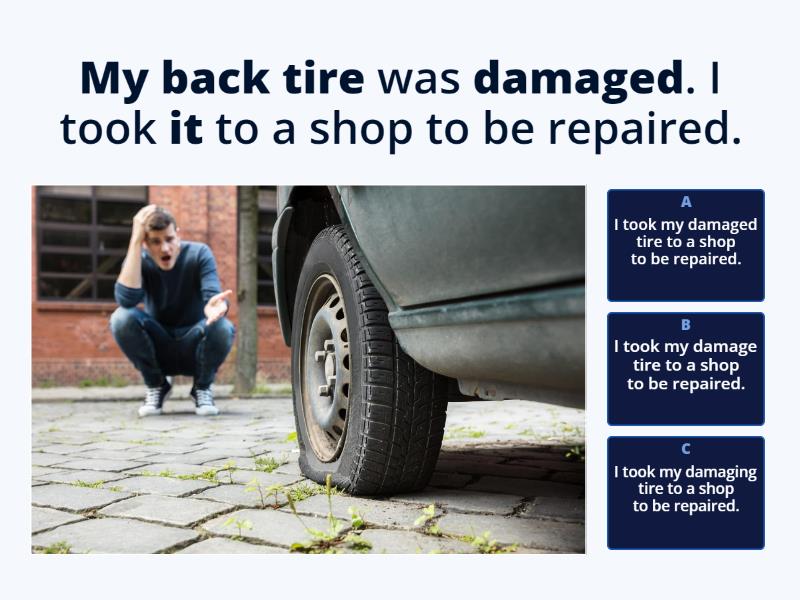 1) My back tire was damaged. I took it to a shop to be repaired. a) I took my damaged tire to a shop to be repaired. b) I took my damage tire to a shop to be repaired. c) I took my damaging tire to a shop to be repaired. 2) Before I left on vacation, my bakery was burglarized. So, I had to inspect it to see what had been stolen. a) I had to inspect my stolen bakery to see what had been stolen. b) I had to inspect my bakery burglarized to see what had been stolen. c) I had to inspect my burglarized bakery to see what had been stolen. d) I had to inspect the burger bakery to see what had been stolen. 3) Just before I left to work, I noticed that my shoes were broken. I had to change it with another pair of shoes. a) I had to change the broken shoes with another pair of shoes. b) I had to change a shoe broked with another pair of shoes. c) I had to change the broke shoes with another pair of shoes. d) I had to change shoes broken with another pair of shoes. 4) When we arrived in Italy, my wife's sunglasses were lost. We couldn't find them, so we had to go buy one at a store. a) We couldn't find the sunglasses lost wife so we had to go buy one at a store. b) We couldn't find the lost sunglasses, so we had to go buy one at a store. c) We couldn't find a lost sunglass, so we had to but one at a store. d) We couldn't find the losed sunglasses, so we had to buy one at a store. 5) Her luggage was damaged when it arrived on the carousel. She had to take it to the customer service to ask for reimbursement. a) She had to take her luggage damaged to the customer service to ask for reimbursement.  b) She had to take her damage luggage to the customer service to ask for reimbursement. c) She had to take her damaged luggage to the customer service to ask for reimbursement. d) Sha had to take her damaging luggage to the customer service to ask for reimbursement. 6) While I was in New York, I noticed my watch got stolen. The police found it and said they sent the thief who stole it to jail. a) The police found the theif's stolen watch and said they sent the thief that stole it to jail. b) The police found the stolen watches and said they sent the thief who stole it to jail. c) The police found the stolen watch and said they sent the thief who stole it to jail. d) The police found my stolen watch and said they sent the thief who stole it to jail. 7) While I was at school, I noticed that my pants and shirts were broken. It was an embarrassing day because I wore them at school all day. a) It was an embarrasing days because I wore my ripped pants and shirts at school all day. b) It was an embarrassing day because I wore my pants and shirts ripped at school all day. c) It was an embarrasing day because I wore my rip pants and shirts at school all day.